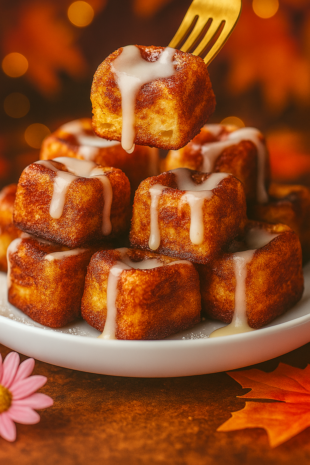 Drizzle the glaze over the warm cinnamon roll French toast bites.